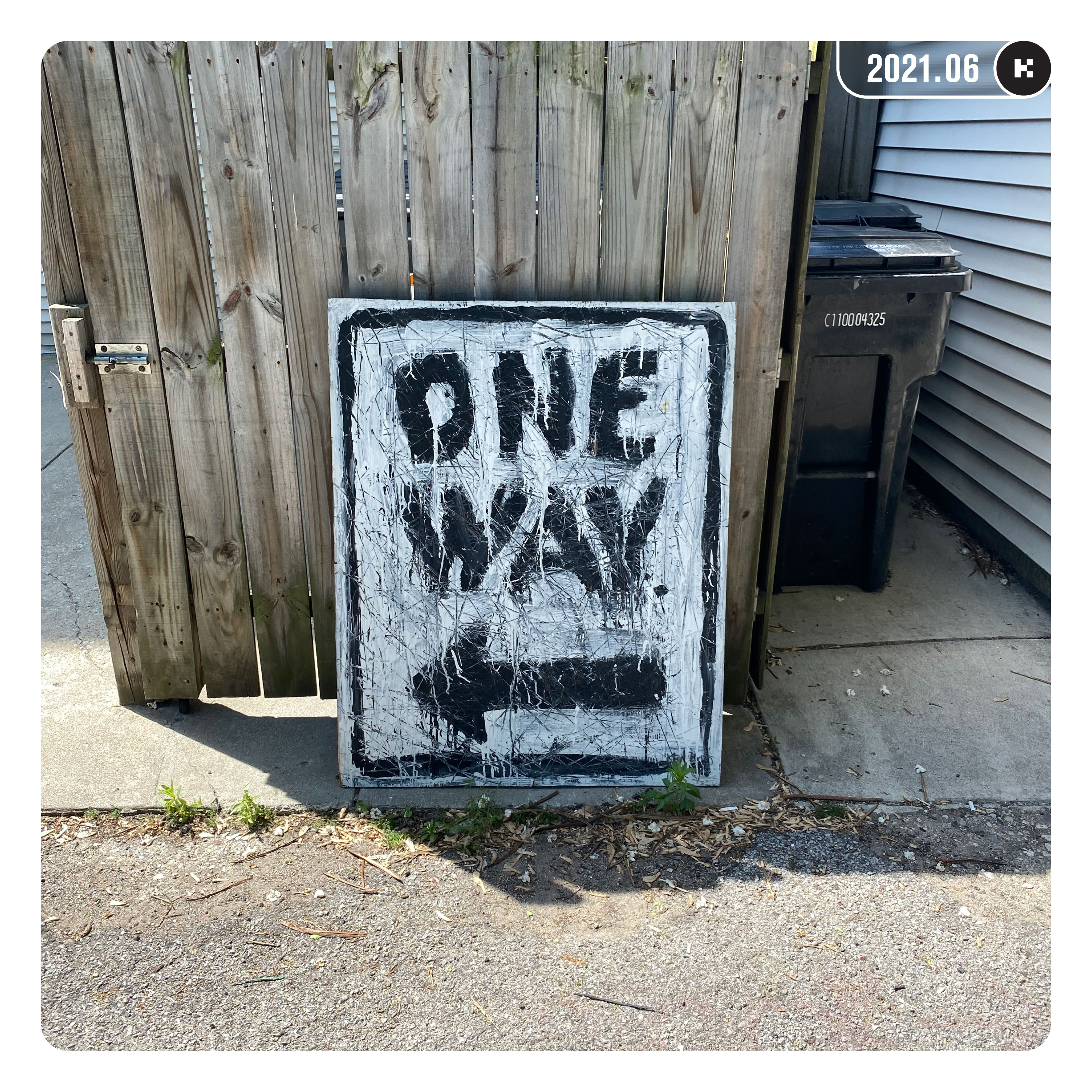 Photo: “One Way” painting that I made as a freshman in college, sitting in the alley in anticipation of a new home. Photographed June 5, 2021.